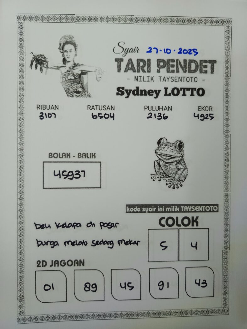 Syair Tari Pendet Sydney Hari ini Senin, 27 Oktober 2025