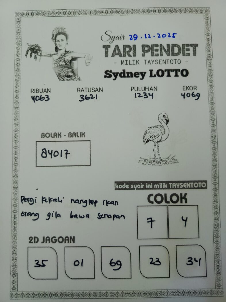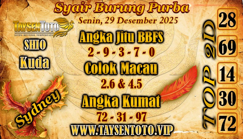 SYAIR TAYSEN SYDNEY – Selamat datang di Situs Prediksi Togel Jitu dan Terpercaya. Hari ini kita akan mengulas Syair Togel Sydney 29 Desember 2025. Syair Sydney ini semata-mata hanya dibuat untuk membantu mempermudah para pemain togel online dalam menebak secara tepat Angka Keluaran Sydney.