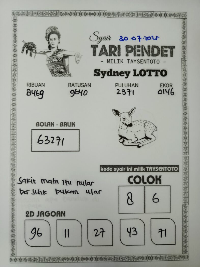Syair Tari Pendet Sydney Hari ini Rabu, 30 Juli 2025