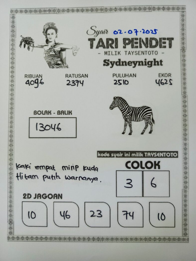 Syair Tari Pendet SydneyNight Hari ini Rabu, 02 Juli 2025