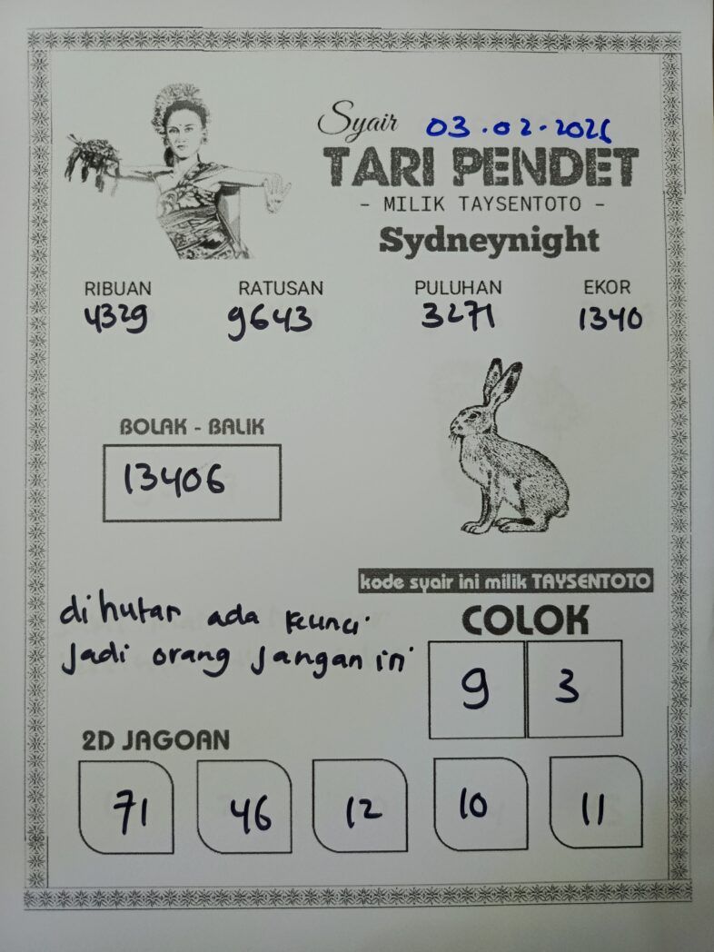 Syair Tari Pendet SydneyNight Hari ini Selasa, 03 Februari 2026