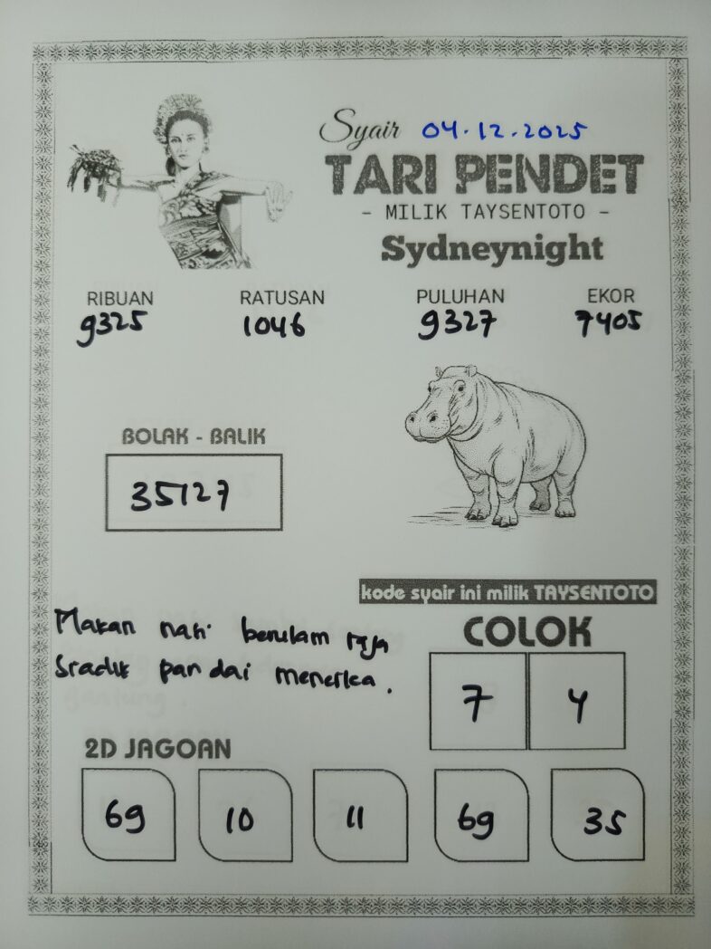 Syair Tari Pendet SydneyNight Hari ini Kamis, 04 Desember 2025