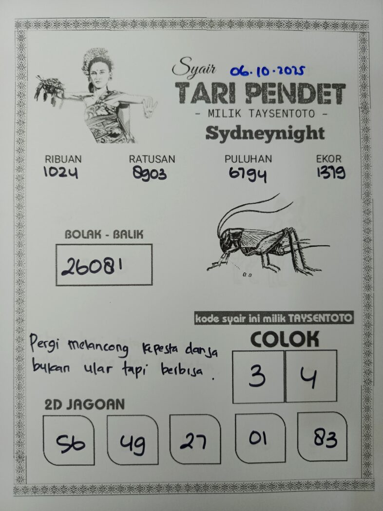 Syair Tari Pendet SydneyNight Hari ini Senin, 06 Oktober 2025
