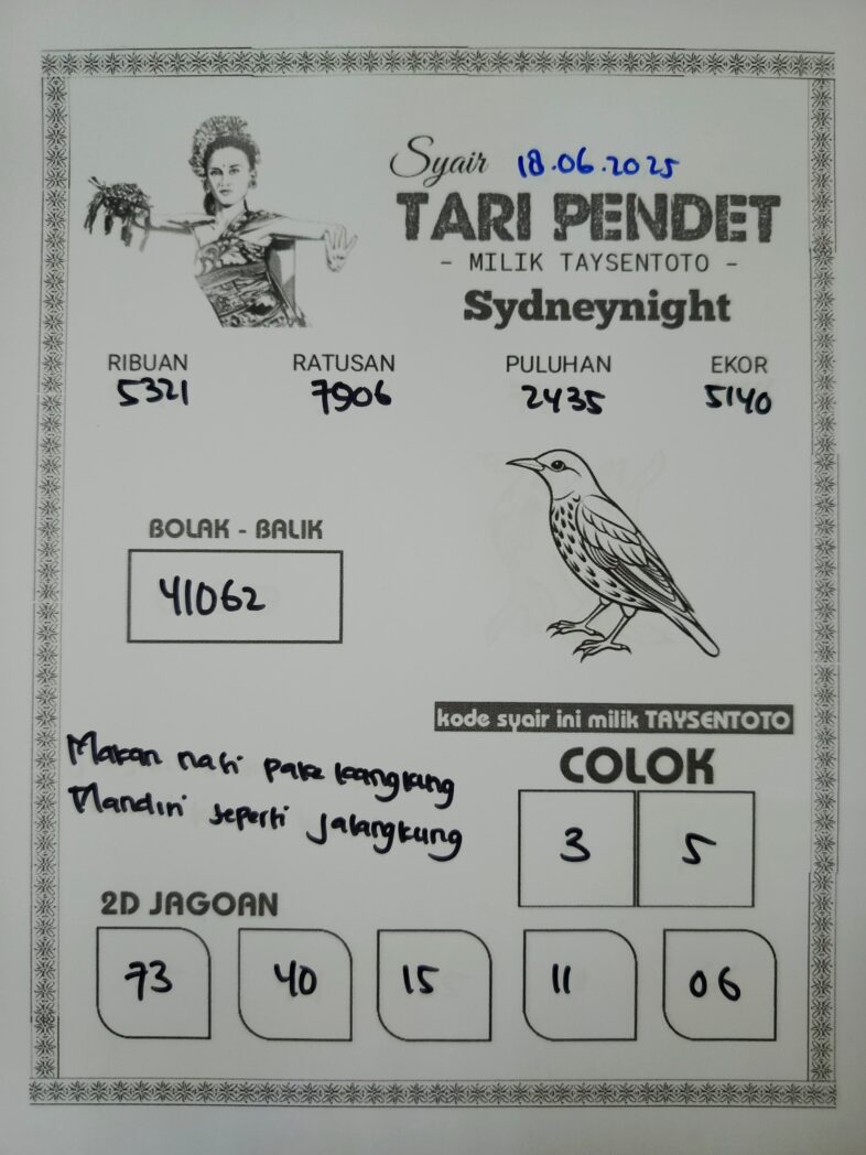 Syair Tari Pendet SydneyNight Hari ini Rabu, 18 Juni 2025