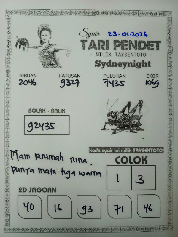 Syair Tari Pendet SydneyNight Hari ini Jumat, 23 Januari 2026