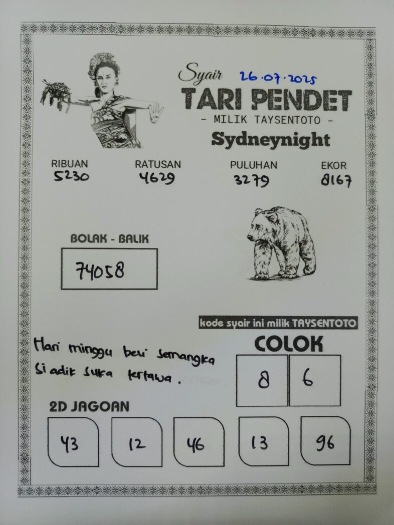 Syair Tari Pendet SydneyNight Hari ini Sabtu, 26 Juli 2025