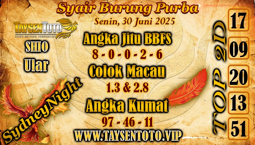 Syair Lipan Sakti Sydney Night Hari ini Senin 30 Juni 2025