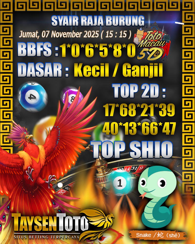Syair Raja Burung Toto Macau 5D Hari Ini Jumat, 07 November 2025| 15 : 15 WIB