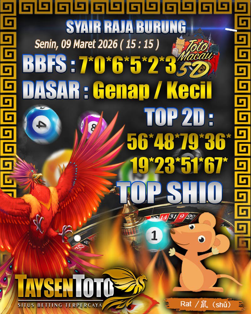 Syair Raja Burung Toto Macau 5D Hari Ini Senin, 09 Maret 2026| 15 : 15 WIB