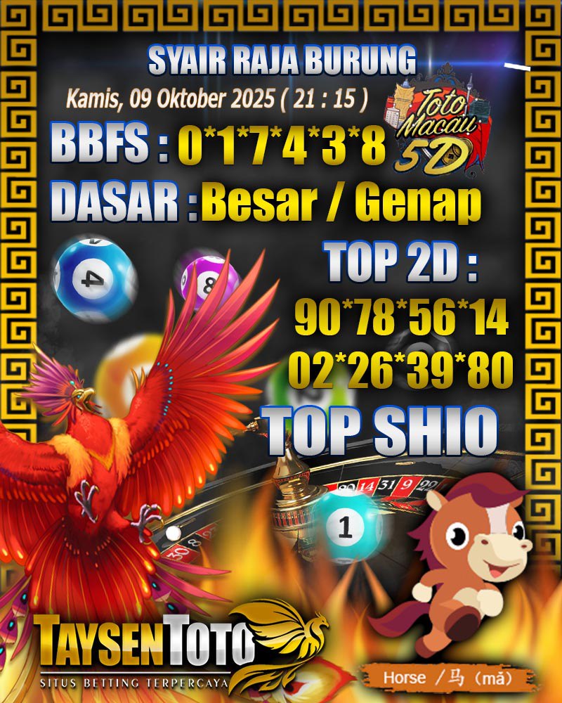 Syair Raja Burung Toto Macau 5D Hari Ini Kamis, 09 Oktober 2025| 21 : 15 WIB