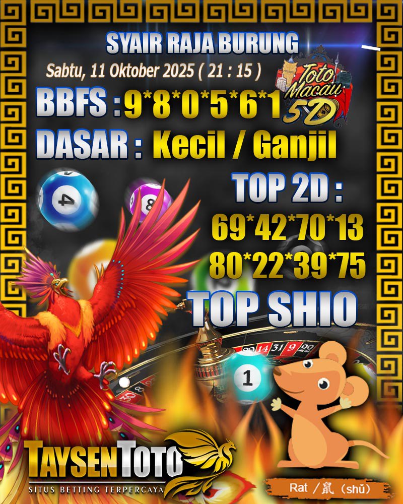 Syair Raja Burung Toto Macau 5D Hari Ini Sabtu, 11 Oktober 2025| 21 : 15 WIB