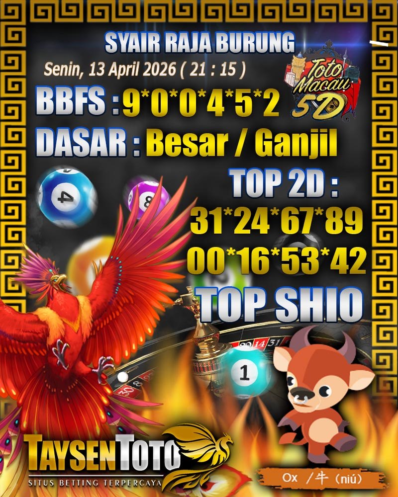 Syair Raja Burung Toto Macau 5D Hari Ini Senin, 13 April 2026| 21 : 15 WIB