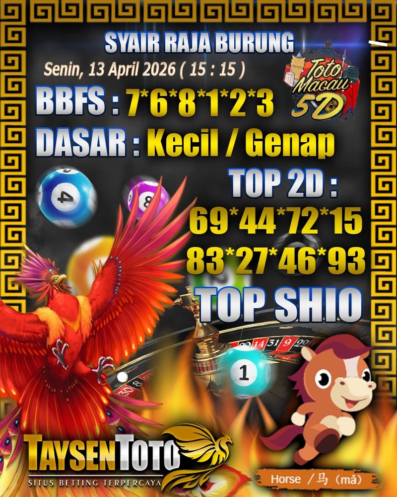 Syair Raja Burung Toto Macau 5D Hari Ini Senin, 13 April 2026| 15 : 15 WIB