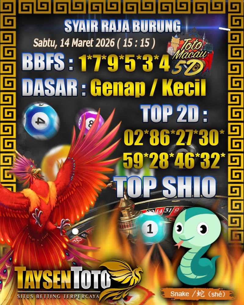 Syair Raja Burung Toto Macau 5D Hari Ini Sabtu, 14 Maret 2026| 21 : 15 WIB