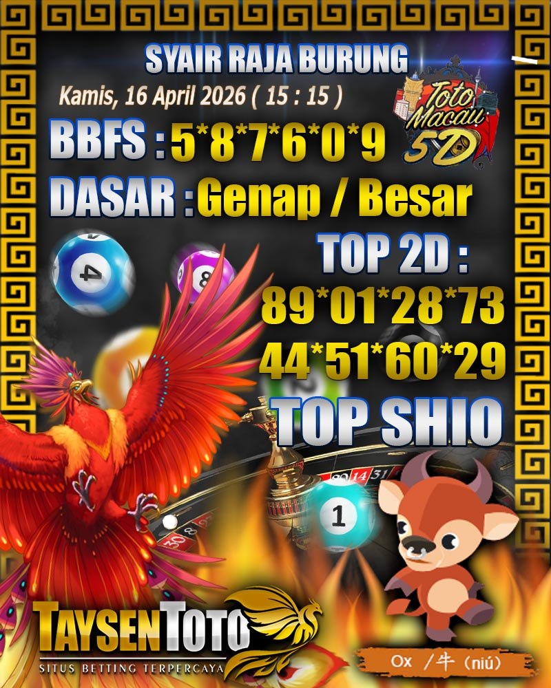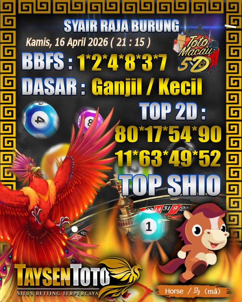 Syair Raja Burung Toto Macau 5D Hari Ini Kamis, 16 April 2026| 21 : 15 WIB