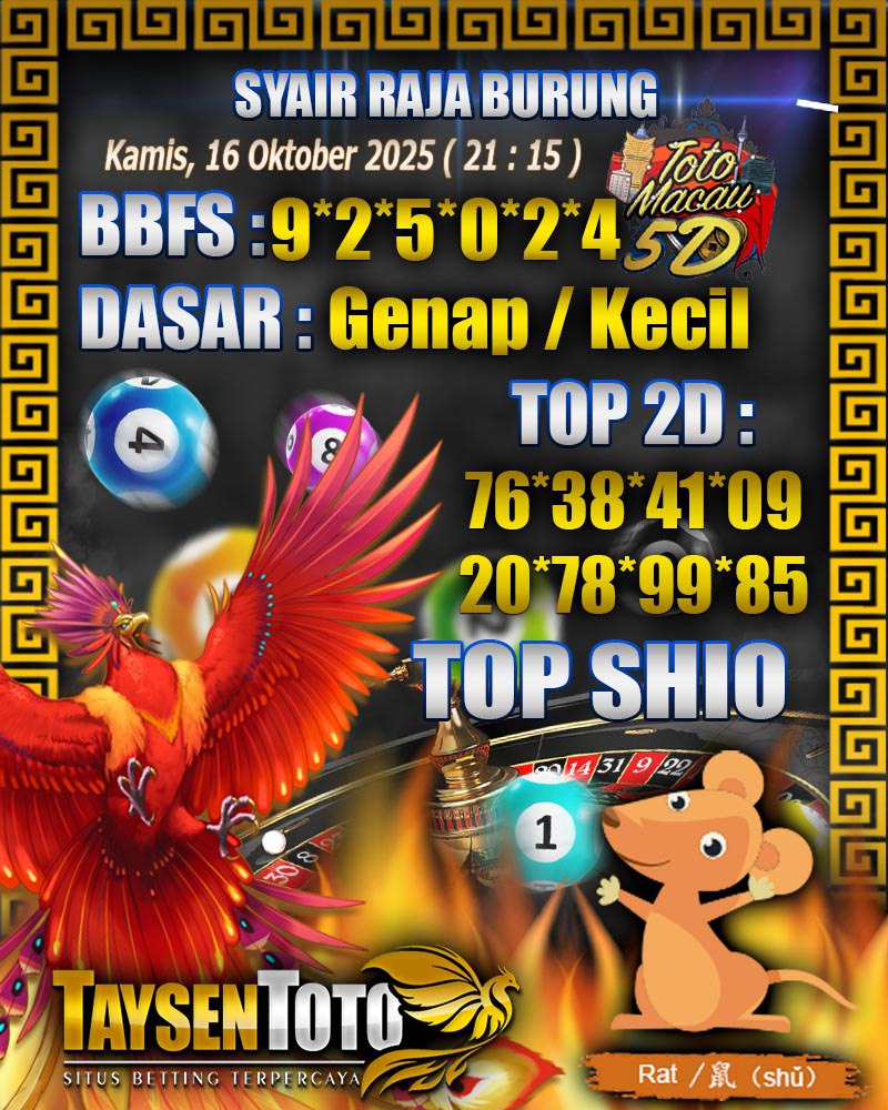 Syair Raja Burung Toto Macau 5D Hari Ini Kamis, 16 Oktober 2025| 21 : 15 WIB