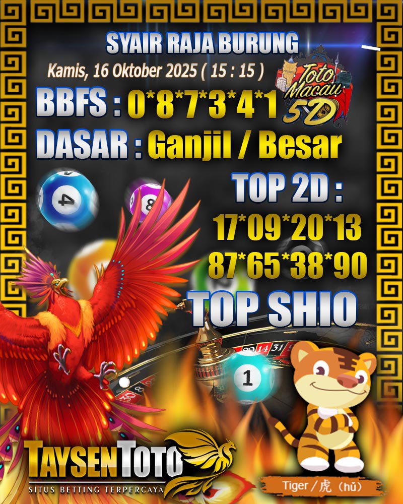 Syair Raja Burung Toto Macau 5D Hari Ini Kamis, 16 Oktober 2025| 15 : 15 WIB