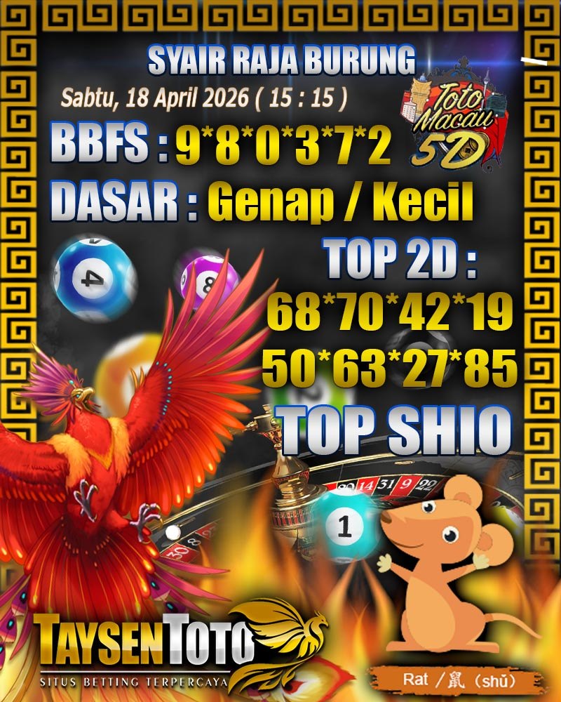 Syair Raja Burung Toto Macau 5D Hari Ini Sabtu, 18 April 2026| 21 : 15 WIB