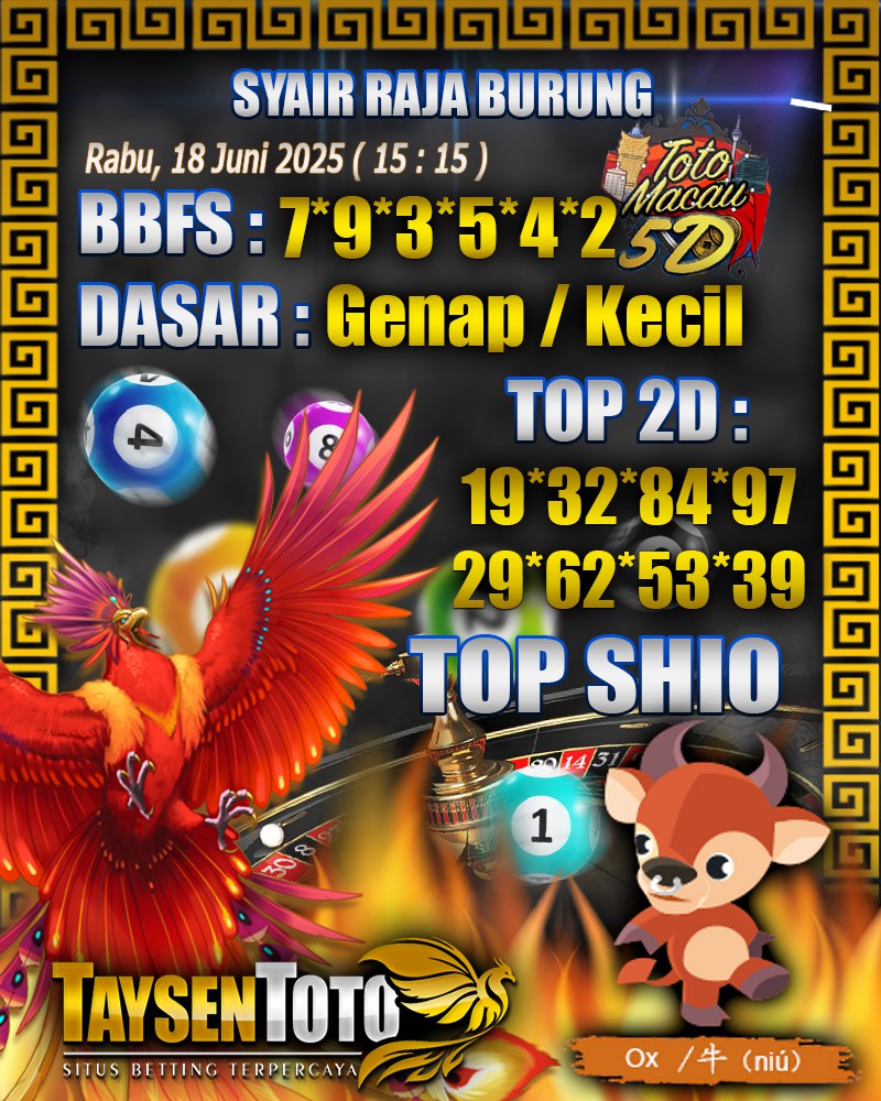 Syair Raja Burung Toto Macau 5D Hari Ini Rabu, 18 Juni 2025 | 15 : 15 WIB