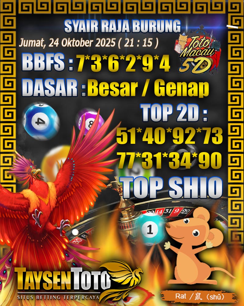 Syair Raja Burung Toto Macau 5D Hari Ini Jumat, 24 Oktober 2025| 21 : 15 WIB
