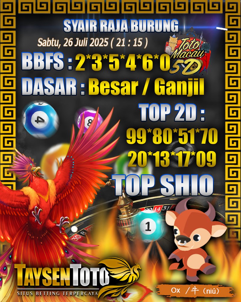 Syair Raja Burung Toto Macau 5D Hari Ini Sabtu, 26 Juli 2025 | 21 : 15 WIB