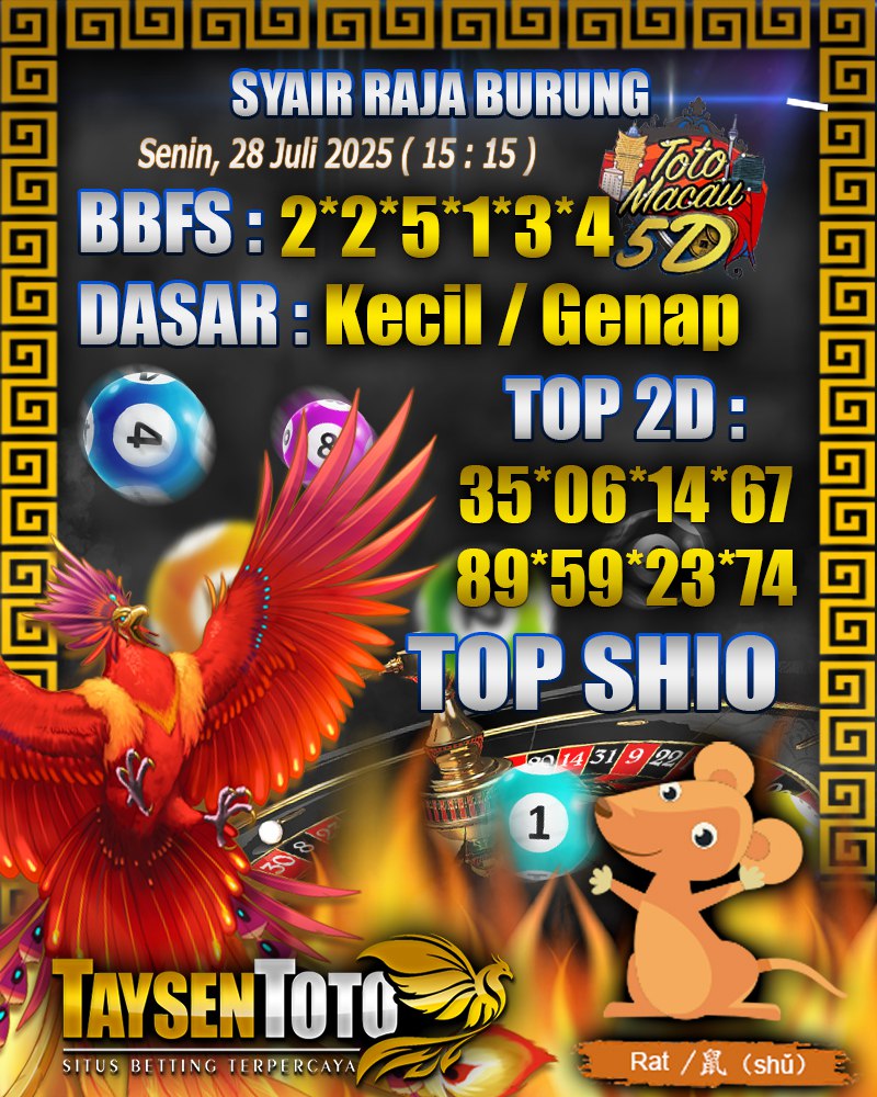 Syair Raja Burung Toto Macau 5D Hari Ini Senin, 28 Juli 2025 | 15 : 15 WIB