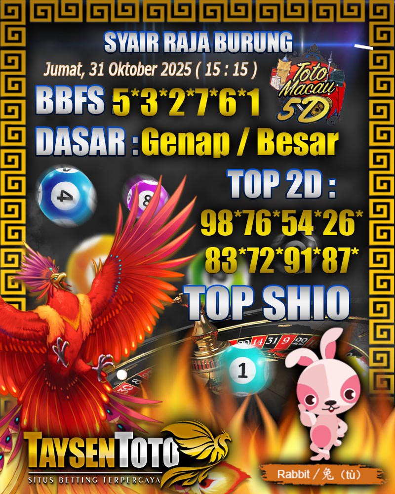 Syair Raja Burung Toto Macau 5D Hari Ini Jumat, 31 Oktober 2025| 15 : 15 WIB