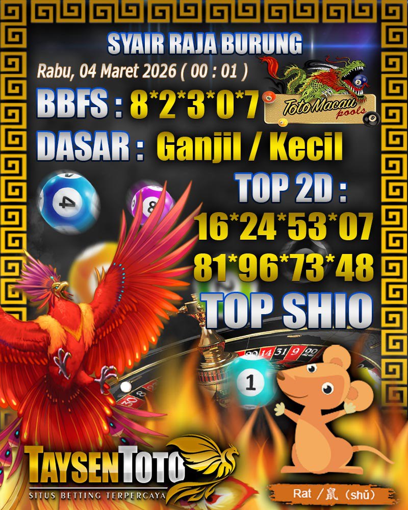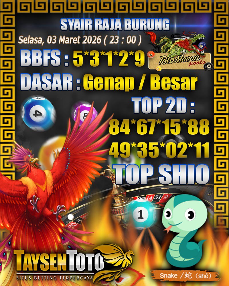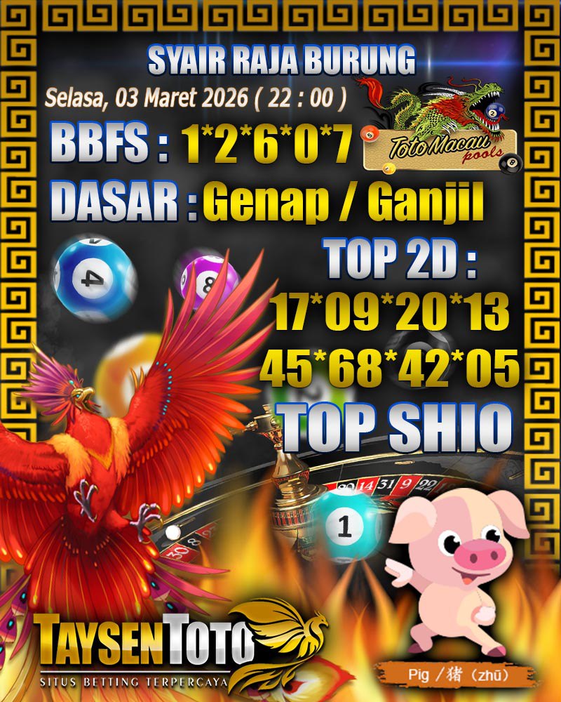Syair Raja Burung Toto Macau Hari Selasa, 03 Maret 2026| 23 : 00 WIB