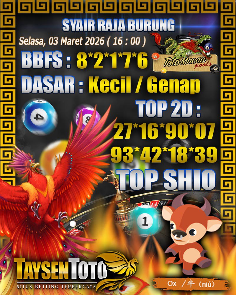Syair Raja Burung Toto Macau Hari Selasa, 03 Maret 2026| 13 : 00 WIB