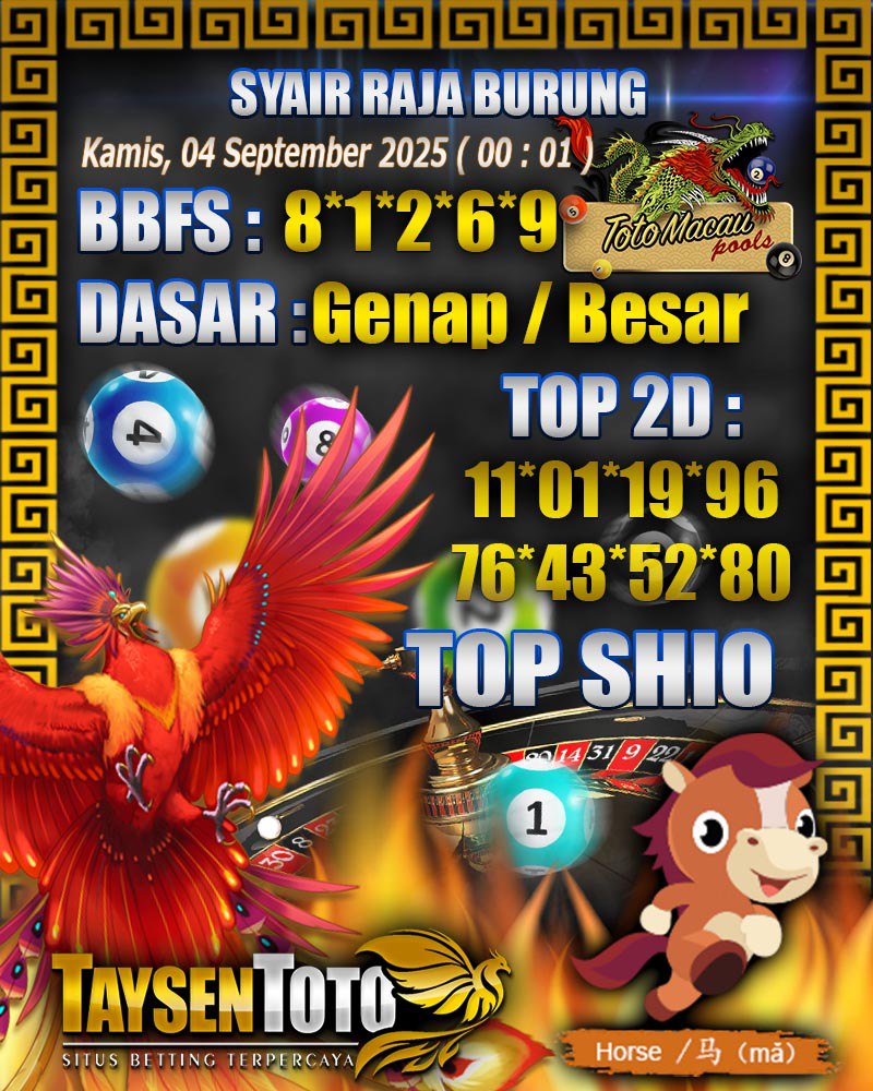 Syair Raja Burung Toto Macau Hari Kamis, 04 September 2025| 00 : 01 WIB