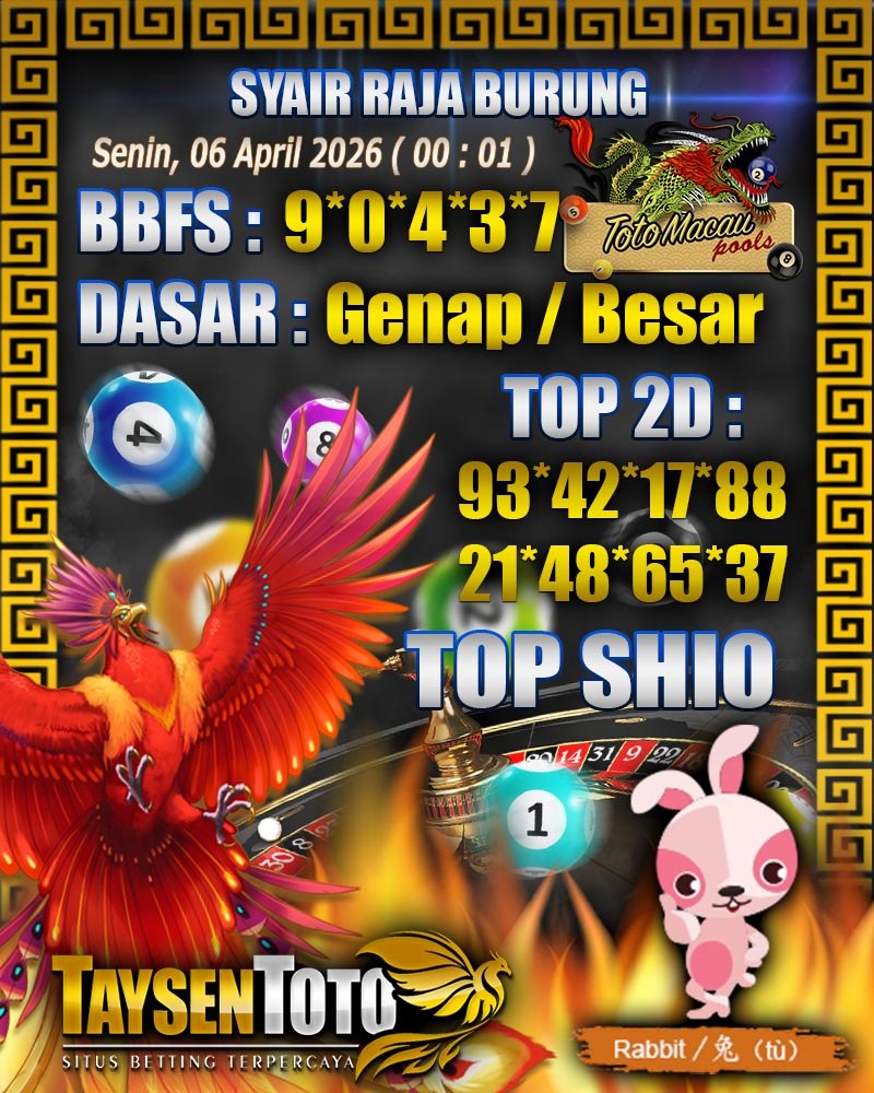 Syair Raja Burung Toto Macau Hari Senin, 06 April 2026| 00 : 01 WIB