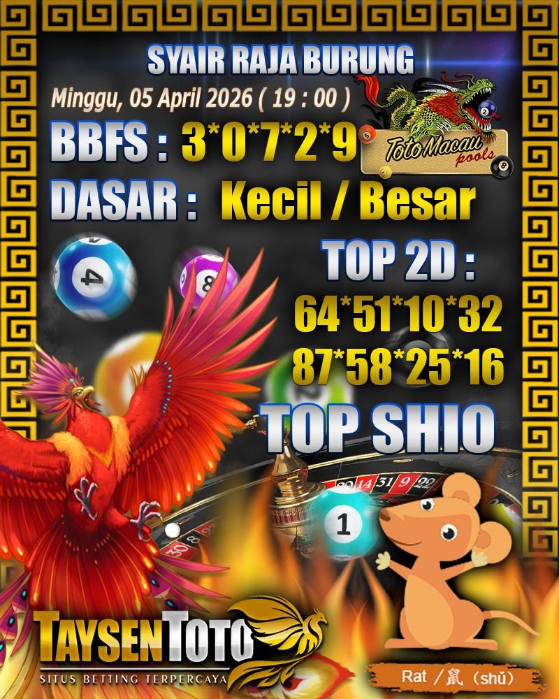 Syair Raja Burung Toto Macau Hari Minggu, 05 April 2026| 19 : 00 WIB
