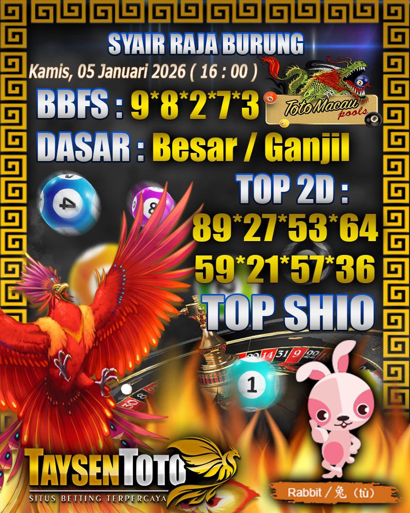 Syair Raja Burung Toto Macau Hari Kamis, 05 Februari 2026| 23 : 00 WIB