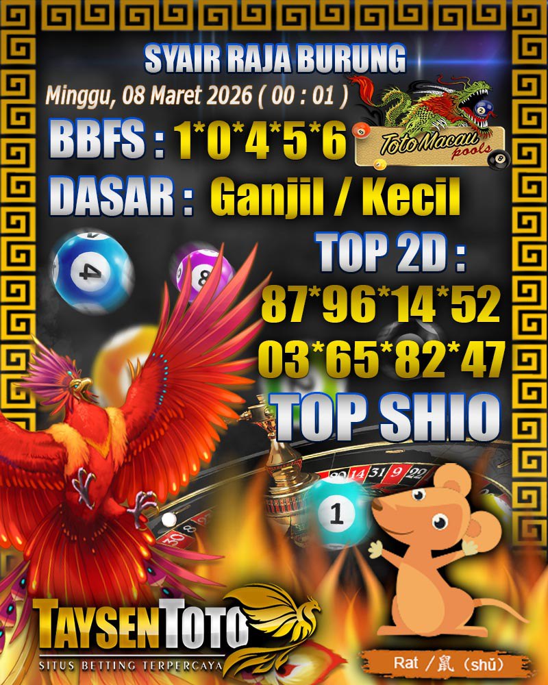 Syair Raja Burung Toto Macau Hari Minggu, 08 Maret 2026| 00 : 01 WIB