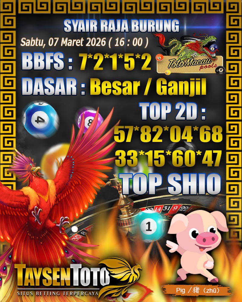 Syair Raja Burung Toto Macau Hari Sabtu, 07 Maret 2026| 16 : 00 WIB