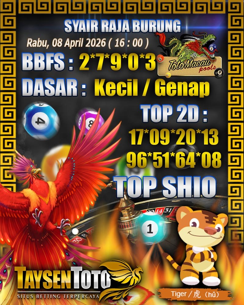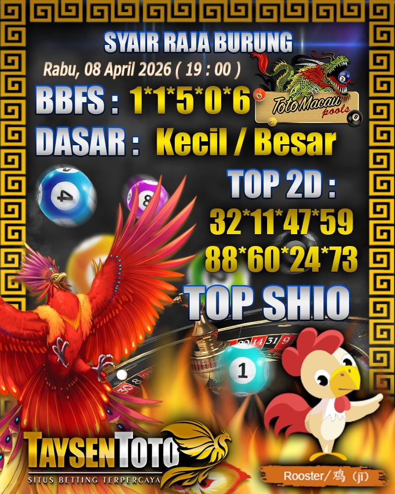 Syair Raja Burung Toto Macau Hari Rabu, 08 April 2026| 23 : 00 WIB