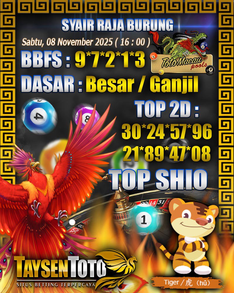 Syair Raja Burung Toto Macau Hari Sabtu, 08 November 2025| 16 : 00 WIB