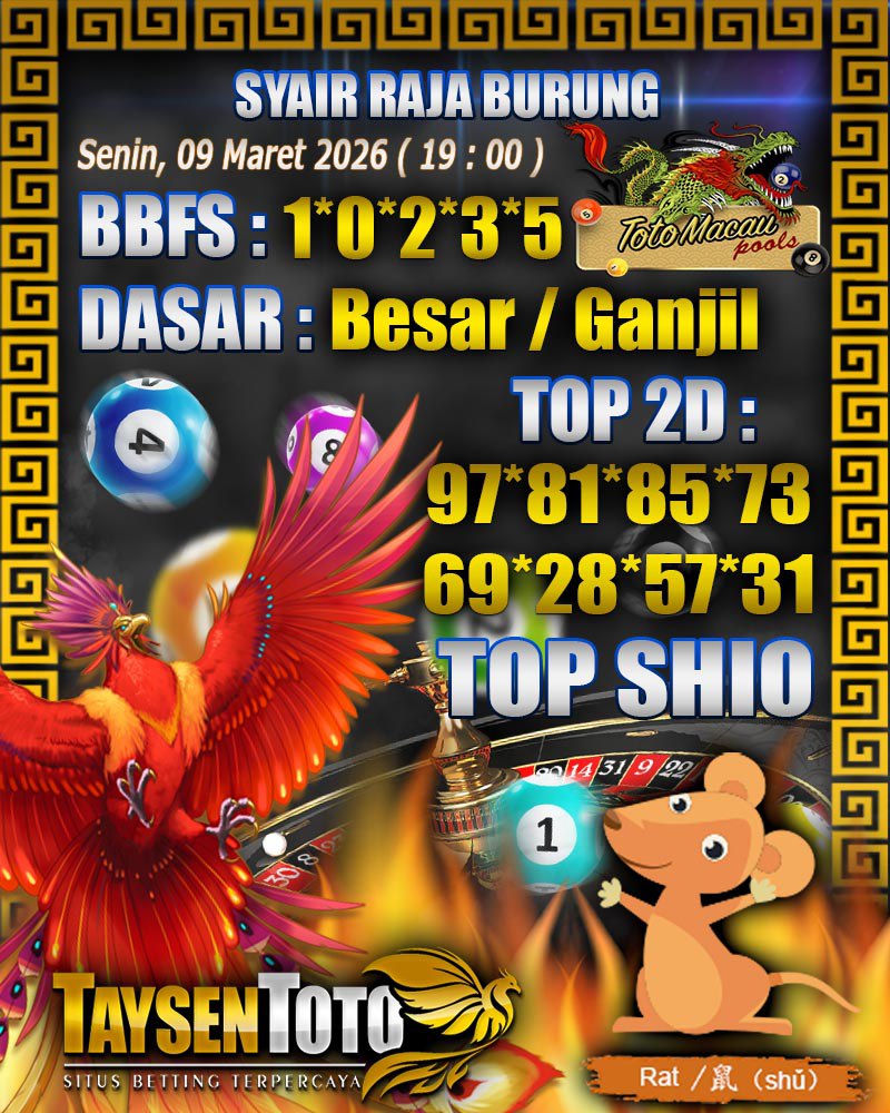 Syair Raja Burung Toto Macau Hari Senin, 09 Maret 2026| 23 : 00 WIB
