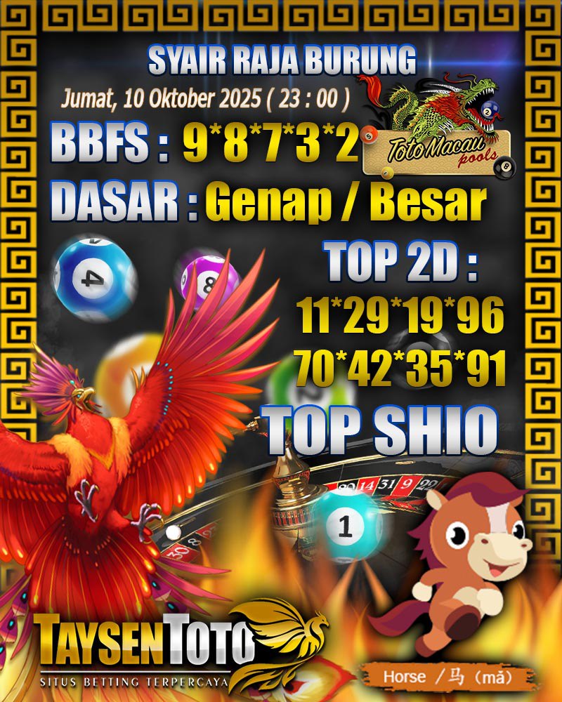 Syair Raja Burung Toto Macau Hari Jumat, 10 Oktober 2025| 23 : 00 WIB