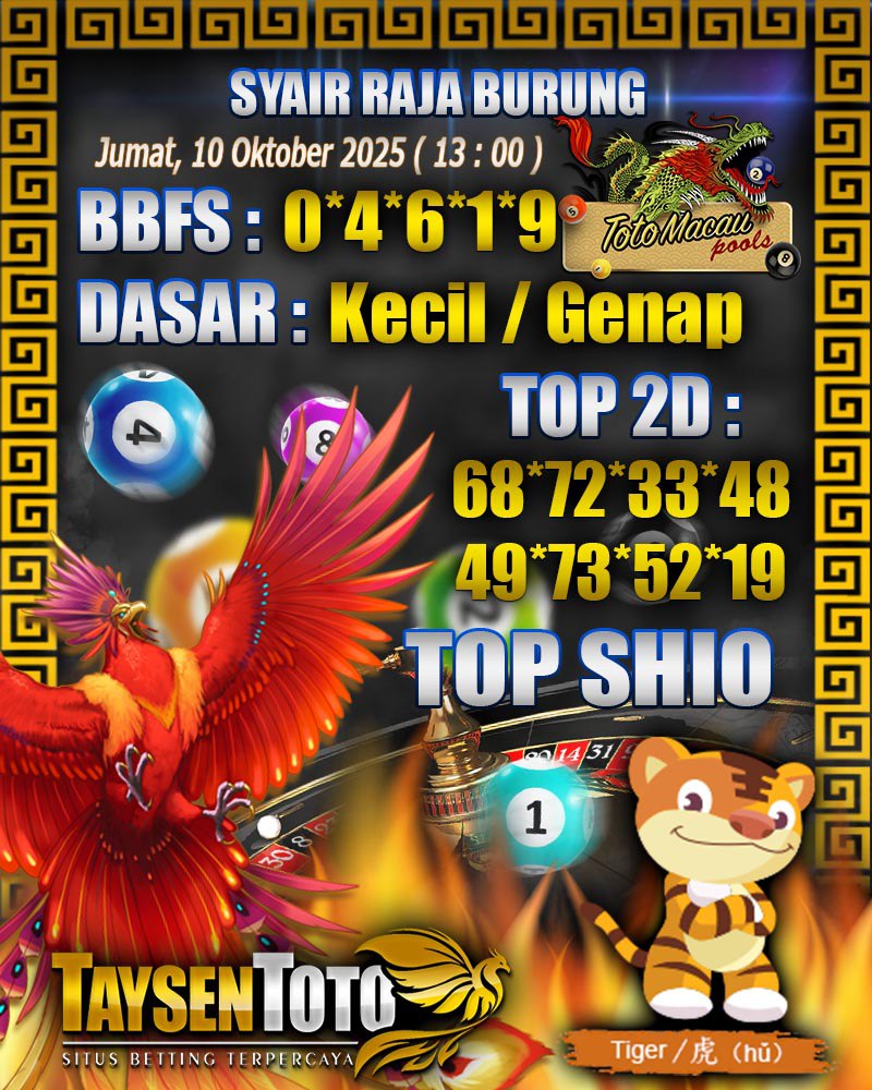 Syair Raja Burung Toto Macau Hari Jumat, 10 Oktober 2025| 13 : 00 WIB