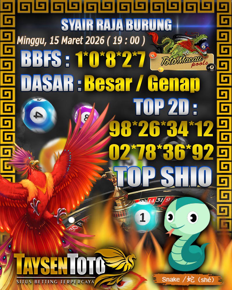 Syair Raja Burung Toto Macau Hari Minggu, 15 Maret 2026| 22 : 00 WIB