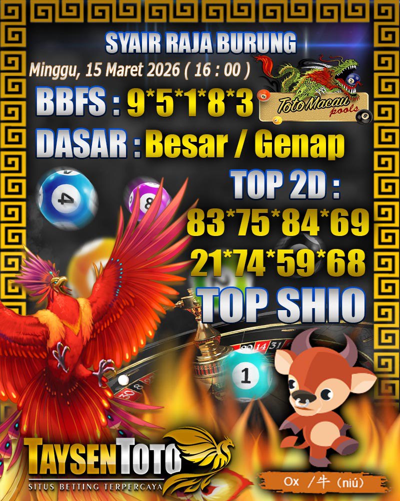 Syair Raja Burung Toto Macau Hari Minggu, 15 Maret 2026| 16 : 00 WIB