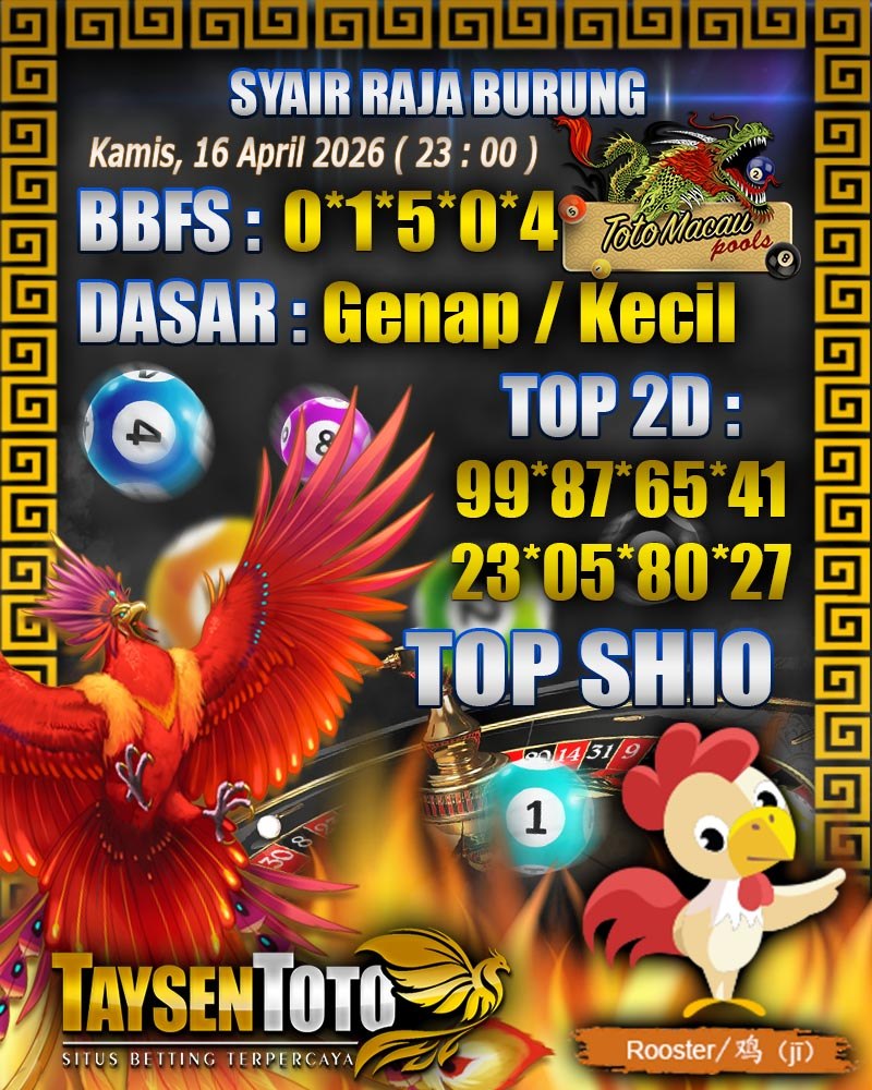 Syair Raja Burung Toto Macau Hari Kamis, 16 April 2026| 23 : 00 WIB