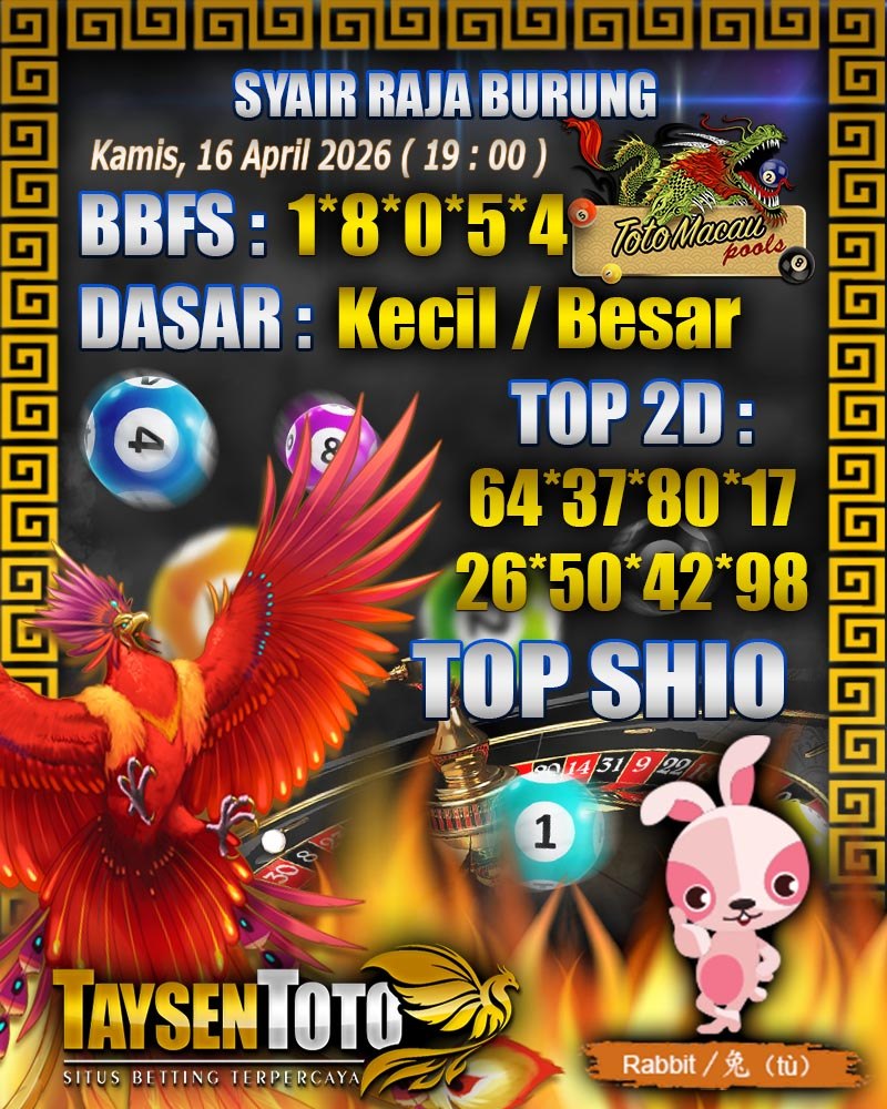 Syair Raja Burung Toto Macau Hari Kamis, 16 April 2026| 19 : 00 WIB
