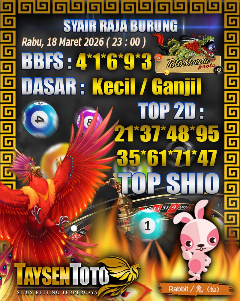 Syair Raja Burung Toto Macau Hari Rabu, 18 Maret 2026| 23 : 00 WIB