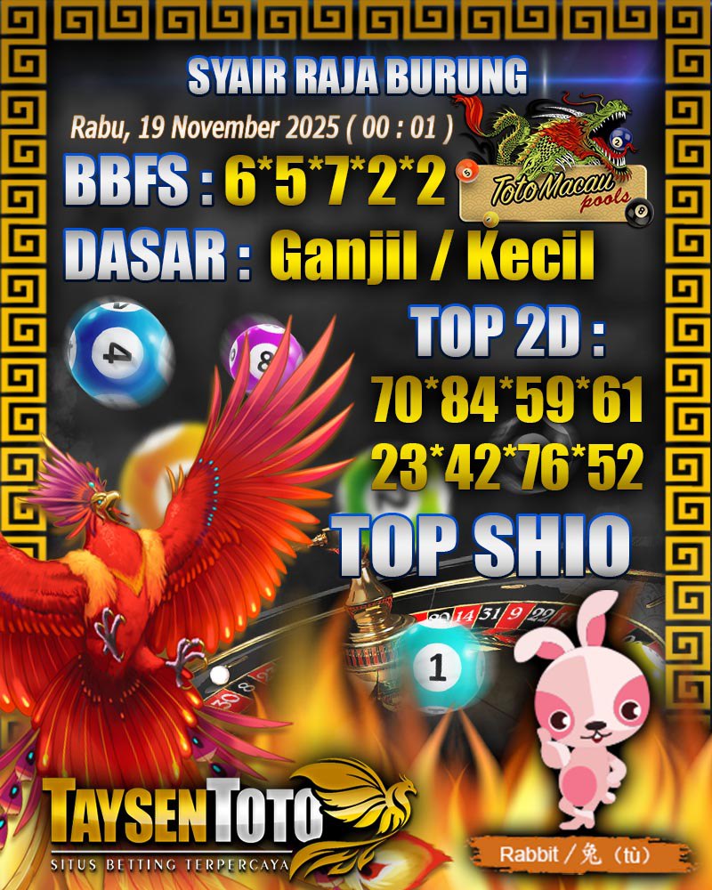Syair Raja Burung Toto Macau Hari Rabu, 19 November 2025| 00 : 01 WIB