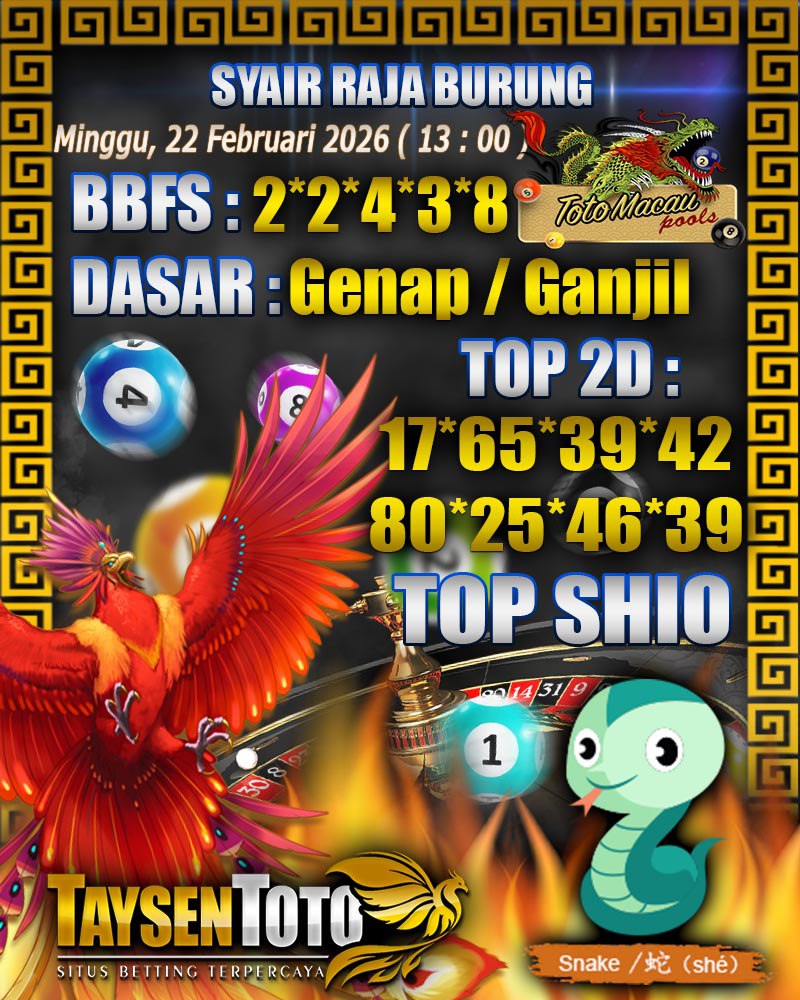 Syair Raja Burung Toto Macau Hari Minggu, 22 Februari 2026| 13 : 00 WIB