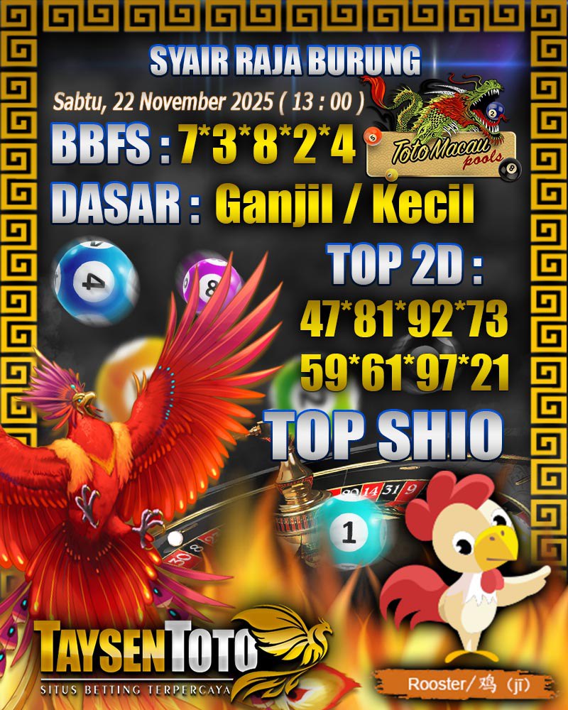 Syair Raja Burung Toto Macau Hari Sabtu, 22 November 2025| 13 : 00 WIB