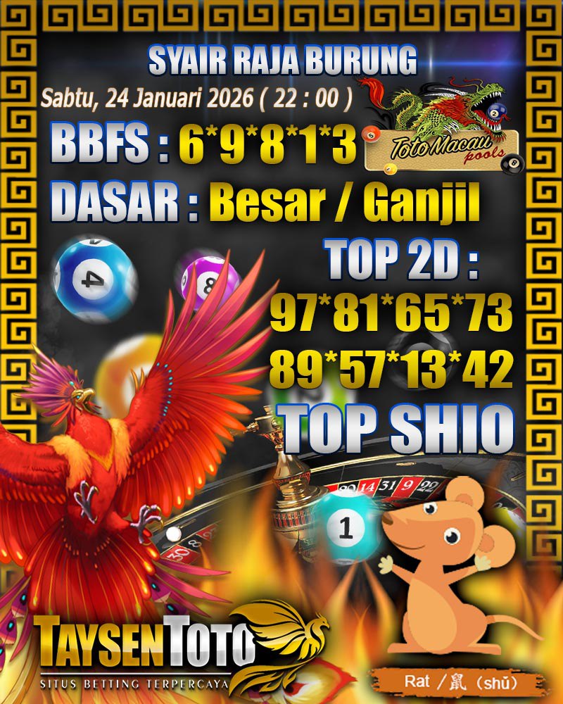 Syair Raja Burung Toto Macau Hari Sabtu, 24 Januari 2026| 22 : 00 WIB