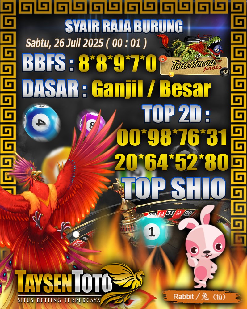Syair Raja Burung Toto Macau Hari, Sabtu, 26 Juli 2025| 00 : 01 WIB